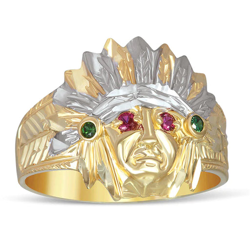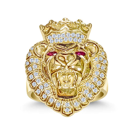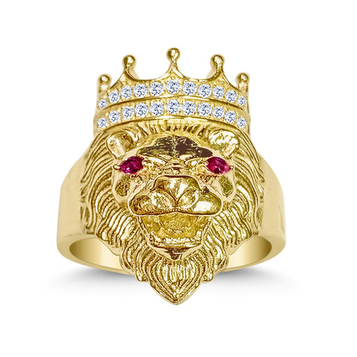 14k Gold King Lion Head with Crown and Red Eyes Ring